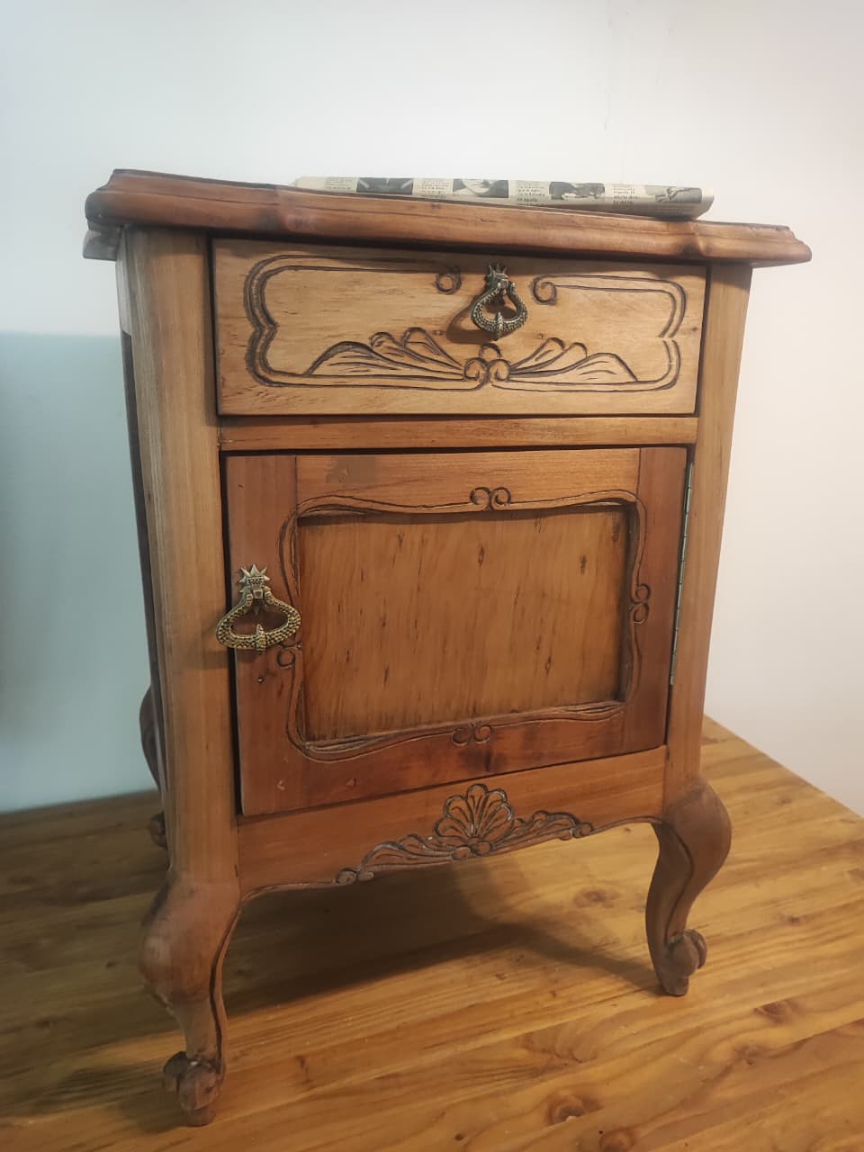 Hermoso velador Normando de los años 50. Madera nativa con grabado hecho a mano protegido con cera de abeja.